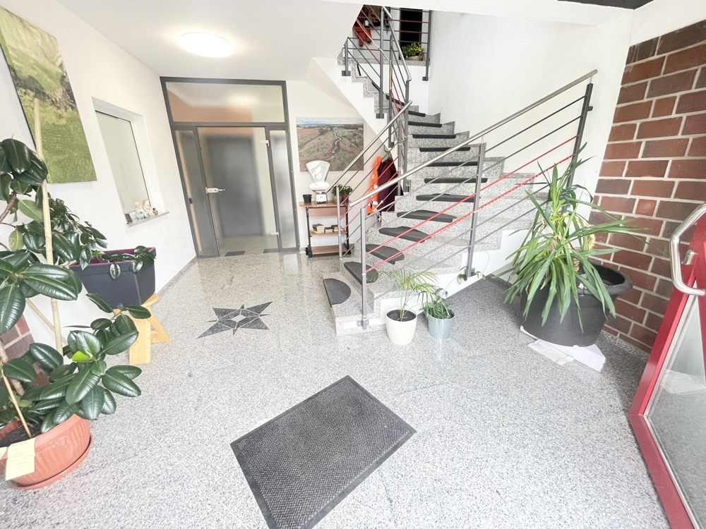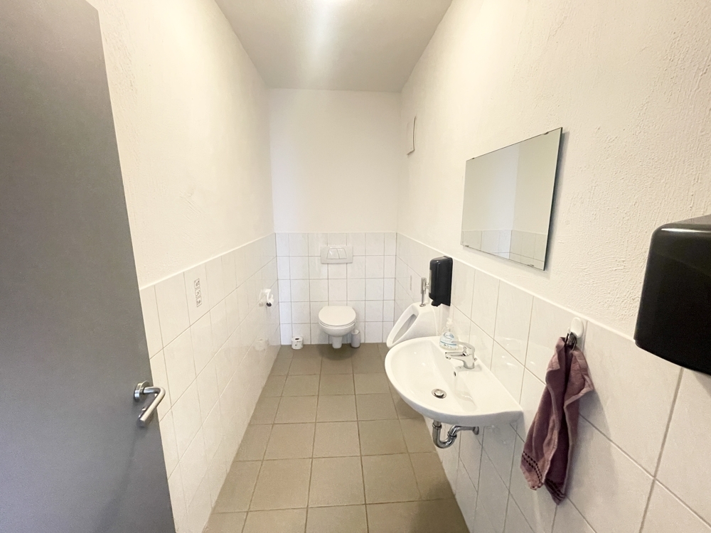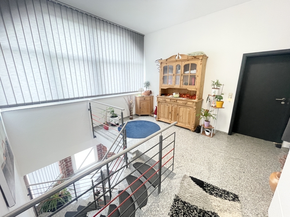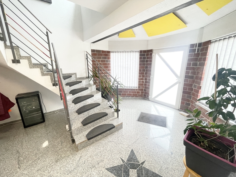 Erdgeschoss (ca. 190 m² Bürofläche): Empfangsbereich, 3 Büroräume, Küche, Bad mit bodengleicher Dusche, 2 Gäste-WCs, Sozialräume, direkter Zugang zur Halle